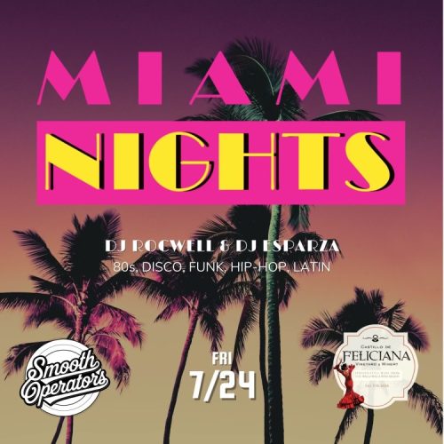 Get ready for a night in paradise! Join us Friday July 24th, 2026, for Miami Night- a high energy summer party featuring Dj Rocwell and Dj Esparza spinning disco, funk, hip hop and Latin beats all night long. Don’t miss this electric evening of music and dancing. Seating is first-come, first-serve so arrive early!